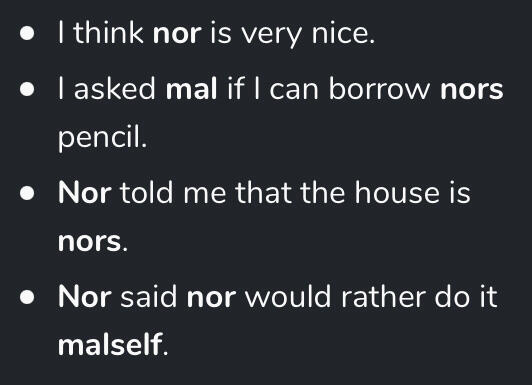 No real meaning behind Nor/Mal pronouns other then reclaiming but if you did what some sort of thing then I guess it means you’re just a dude! A pal! A fella! A little lady!
